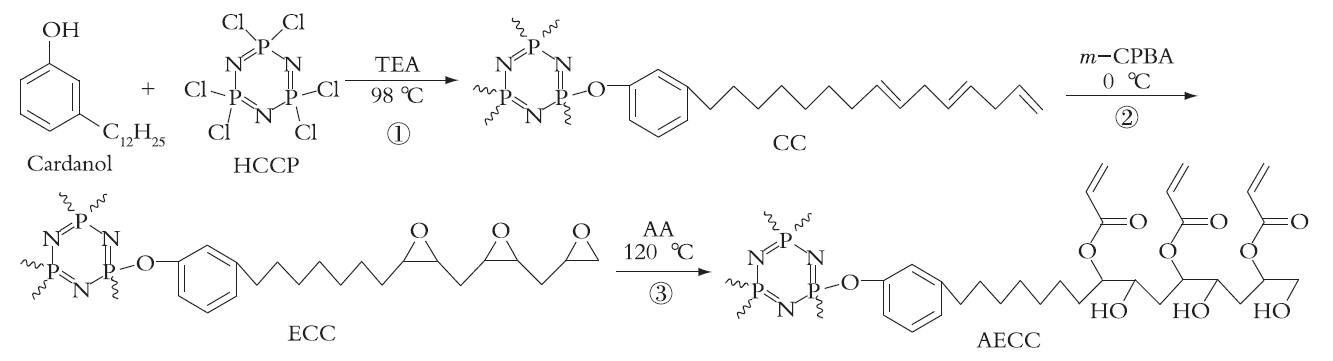 [15,16]。本研究以腰果酚(Cardanol)与六氯环三磷腈(HCCP)作为主要原料,合成多臂腰果酚基低聚物,再通过环氧化及丙烯酸化改性引入丙烯酸酯基团制备新型生物基光固化树脂,并与商品化植物油树脂AESO进行对比,该研究为腰果酚在UV固化木器涂料领域中的应用提供了一条新的途径。